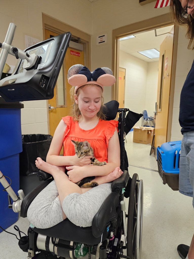 After therapy in June, I went back to summer school with my friends for four weeks. I had so much fun. If you did not know I really like this guy Mikey in my class and I got caught giving him a kiss. Do not tell Poppy. I am also a fur aunt again. Just before the end of the school year Poppy and MS Marge found a kitten at my school. Well, Boppy (Natascha) adopted the kitten. When she came to pick him up she came up to my school and let me hold him. Oh, he is so cute I did not want to let him go. Boppy also has a hamster named Sparrow. So I am aunt to Captain Jack Sparrow.