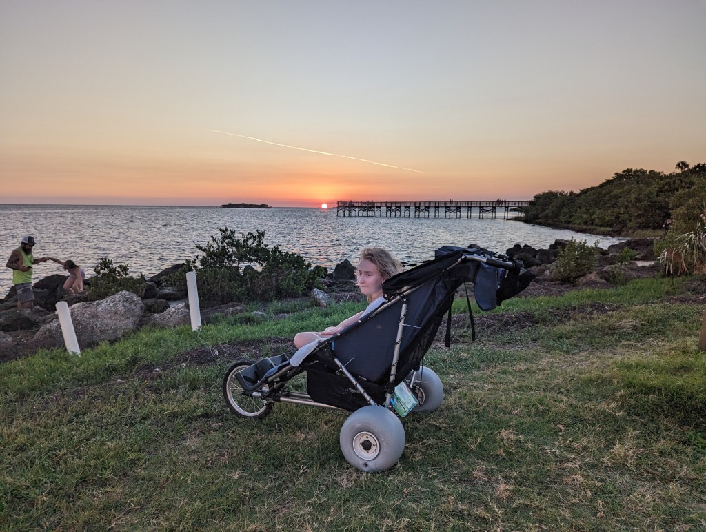 Can we say we had an awesome month for equipment in July. First poppy got my tri-cycle out of storage and fixed it up. We went for my first bike ride in a long time. He took me on the Withlacoochee Trail, which is where we run every weekend. It was so fun riding a bike like everyone else. Unfortunately, it was a very hot July, so we only went a few times. When it gets cooler out, I will make sure I am heard LOUD (and I mean LOUD) and clear to go ride my bike. Most kitchen tables are not made for wheelchairs. I had one in the past that Poppy and Mommy made for me, but it was to big for our current home. So poppy made me a new one. I really like it. I can sit in my wheelchair or a regular chair. The legs are adjustable and there is no bar under the table hitting my feet. Also when I am sitting at it I can spy on poppy to see what he is cooking in the kitchen. I do not do snow; I like white sandy beaches. Here is the problem, wheelchairs do not go on sand and I can only go so far in a wagon. Poppy did some research and found Jjstoysforfriends.org. The provided custom wheels for my running stroller. I was able to go all the way on the beach and Poppy pushed me for over an hour the first night. It was awesome. It does not stop there, JJsToysforFriends also provided an attachment for my running stroller to be a chariot on Poppy’s bike. It is way too hot, but I cannot wait to go really fast. Poppy said next year he is going to complete a Sprint Triathlon with me. If all goes well, he will swim and pull me in a boat .25 miles, bike for 10 miles and run 3.1 miles. I am really hoping we can, it would be so much fun. Keep an eye out in 2024.